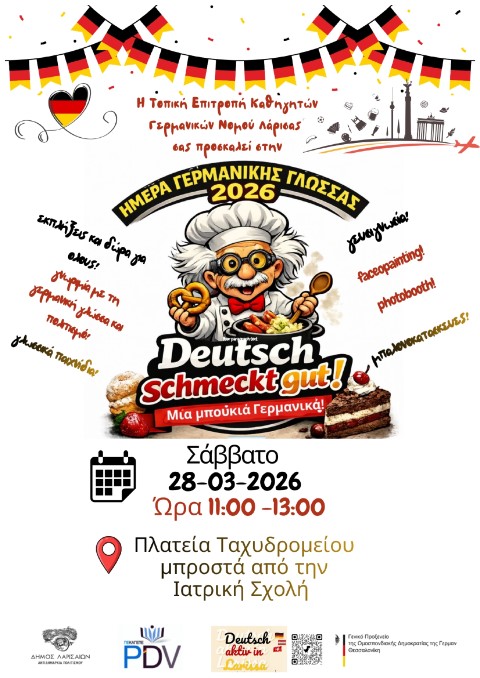 Στις 28/03/2026 το σχολείο μας έλαβε μέρος στην Ημέρα Γερμανικής Γλώσσας, που διοργανώθηκε από τον Πανελλήνιο Σύλλογο Καθηγητών Γερμανικής Γλώσσας ΠΕ, το Γενικό Προξενείο της Ομοσπονδιακής Δημοκρατίας της Γερμανίας στη Θεσσαλονίκη και του Goethe Institut στην πλατεία Ταχυδρομείου της πόλης μας με την υποστήριξη επίσης και του Δήμου Λαρισαίων. Οι μαθητές/τριες μας συμμετείχαν στις δραστηριότητες της δράσης, ενώ έλαβαν και ενεργό μέρος βοηθώντας εθελοντικά στην διεξαγωγή αυτής. Η Ημέρα αυτή είχε στόχο να αναδείξει τον πολιτισμό των γερμανόφωνων χωρών, τις προοπτικές για σπουδές και εργασία, όπως επίσης και να επισημάνει την αξία του να μαθαίνεις κανείς/καμία την γερμανική γλώσσα. Τα παιδιά απόλαυσαν γερμανικές γεύσεις, συμμετείχαν σε γλωσσικά παιχνίδια και κατασκευές και ήρθαν σε άμεση επαφή με τον γερμανόφωνο πολιτισμό μέσα από βιωματικές δράσεις. Η διεύθυνση του σχολείου μας αλλά και η καθηγήτρια των γερμανικών ευχαριστούν τα παιδιά για την ενεργό συμμετοχή τους στην ημέρα αυτή.